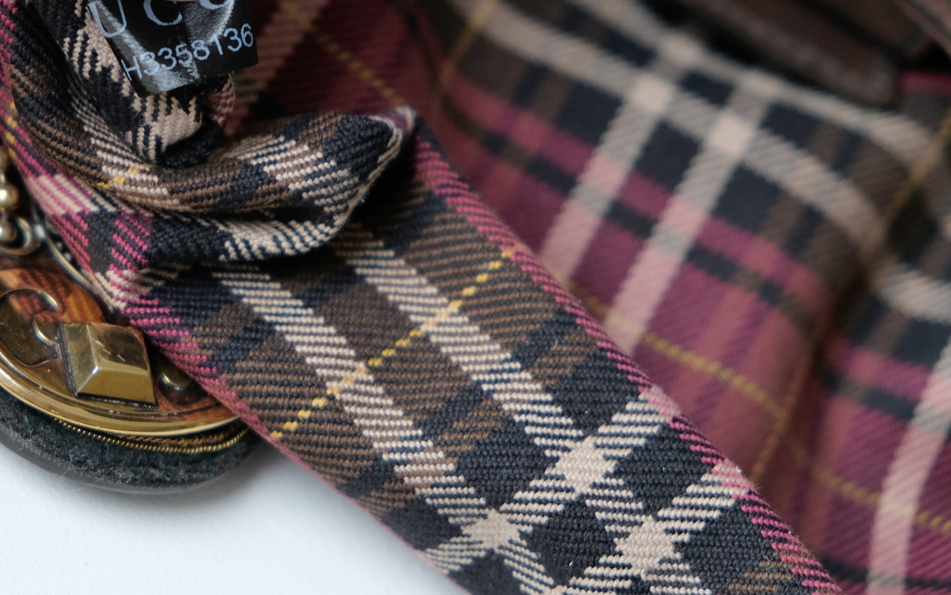 Dual leather handles and an optional longer strap make it easy to carry day or night. The interior is lined in a signature plaid fabric with zip and slip pockets for organization.