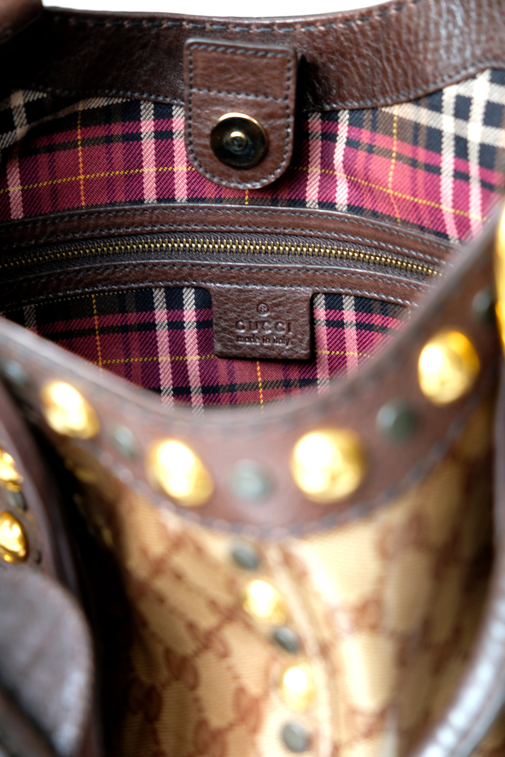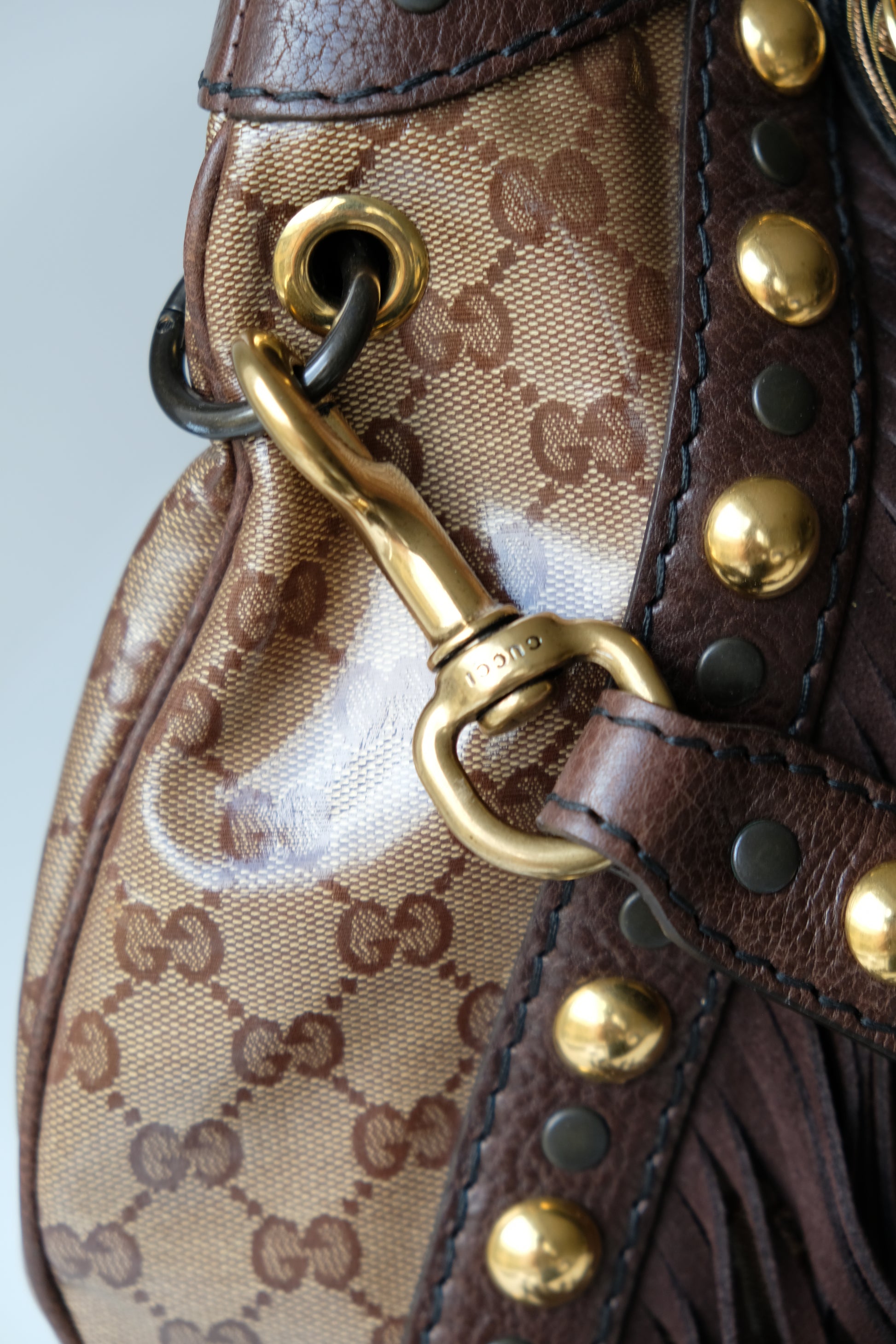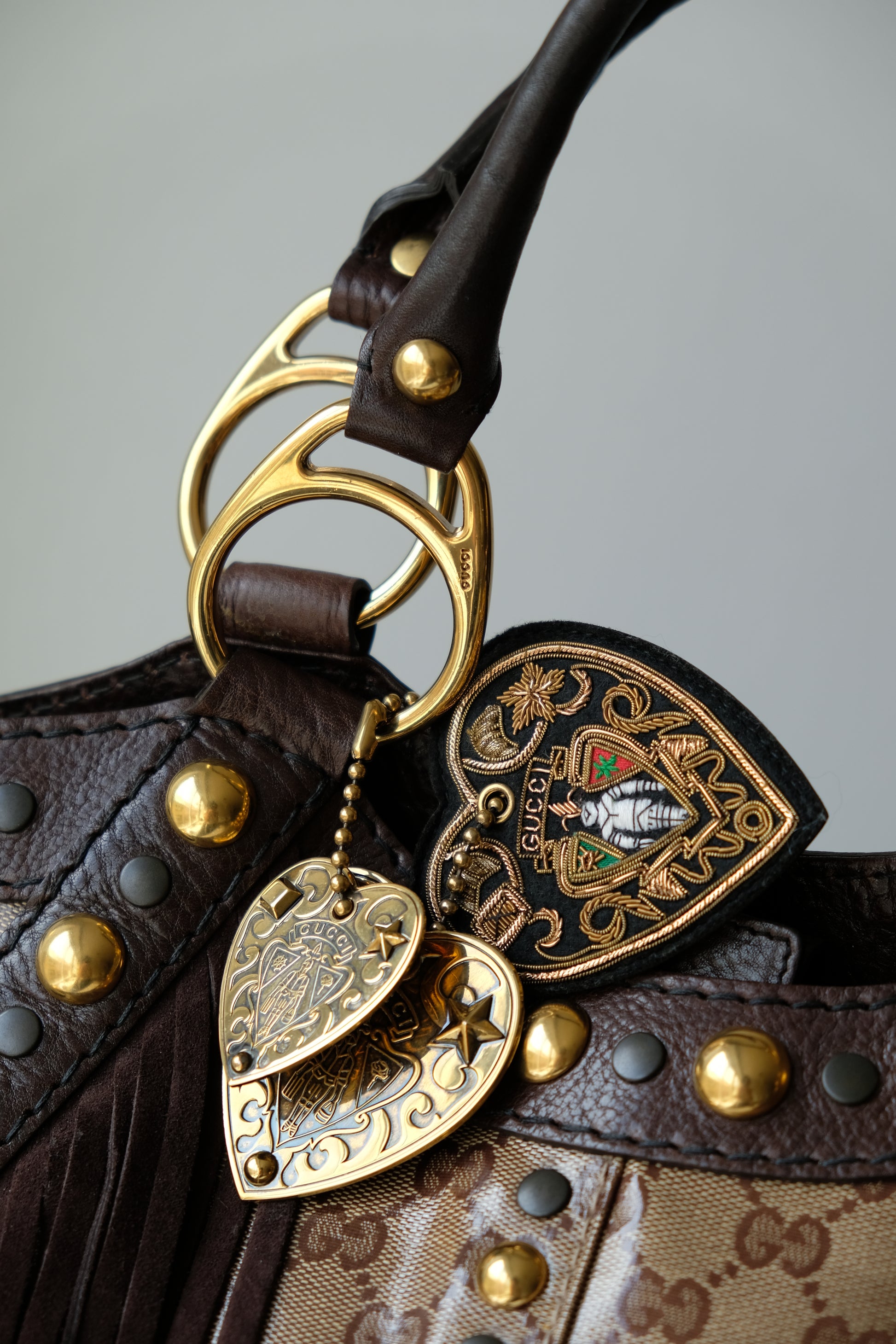 This bold and beautifully crafted Gucci Babouska Hysteria handbag is a rare statement piece that blends the brand’s signature monogram with a rich bohemian twist. Made from GG Crystal canvas and brown leather, it features dramatic leather fringe, antique gold-tone studs, and the iconic Gucci Hysteria medallion.